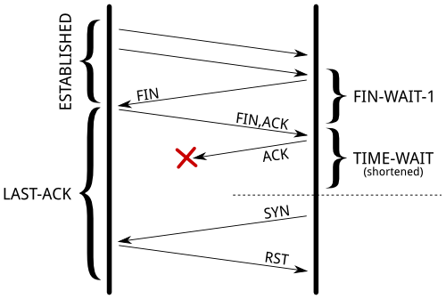 패킷 유실에 따른 비정상적인 통신흐름이 발생할 수 있다. 가령, 아래 그림과 같이 마지막 ACK가 중간에 유실될 경우 FIN에 대한 ACK를 받지 못했기에 LAST-ACK상태이고, SYN 요청에 대해 RST를 보낸다.